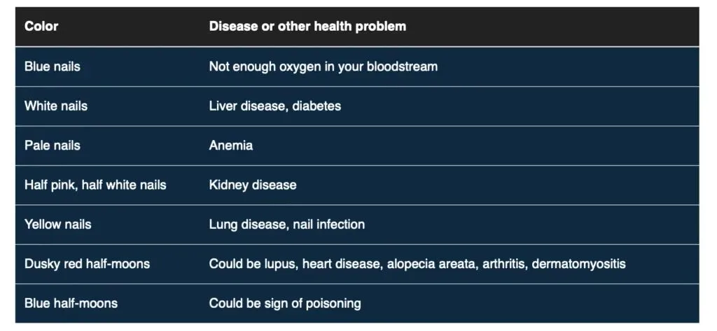 A disease inside your body can cause your nails to change color. Certain color changes can be a warning sign of a specific disease, as the following table shows.