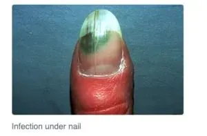 Greenish black colorWhen bacteria cause a nail infection, the nail can turn greenish black as shown here.