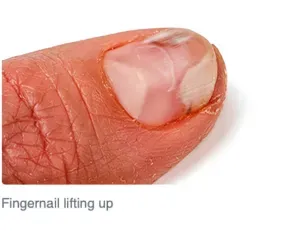 If a nail starts to lift up so that it’s no longer completely attached, you’ll likely see white discoloration, as shown here. When a nail lifts up, the cause is often: - A fungal infectionInjury form cleaning under your nails with a sharp object