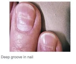 Deep grooves (or gaps)Lines that run the length of a nail are common and usually nothing to worry about. If you see deep grooves that run the width of your nail like the ones shown in this picture, it means that something slowed (or stopped) your nails from growing for a while.