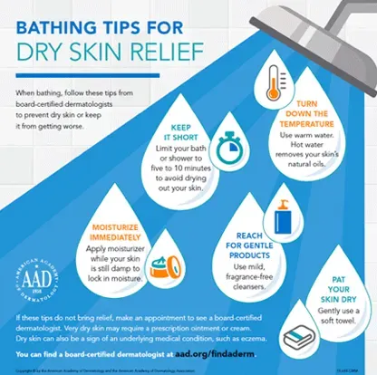 - Stop baths and showers from worsening dry skin. When the humidity drops or your skin feels dry, be sure to: