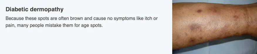 Unlike age spots, these spots often start to fade after diabetes is well-controlled, usually within 18 to 24 months. Diabetic dermopathy can also stay on the skin indefinitely.