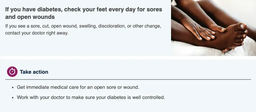 Centers for Disease Control and Prevention. “ Diabetes and your feet.” Last updated 4/11/2023. Last accessed 11/28/2023.