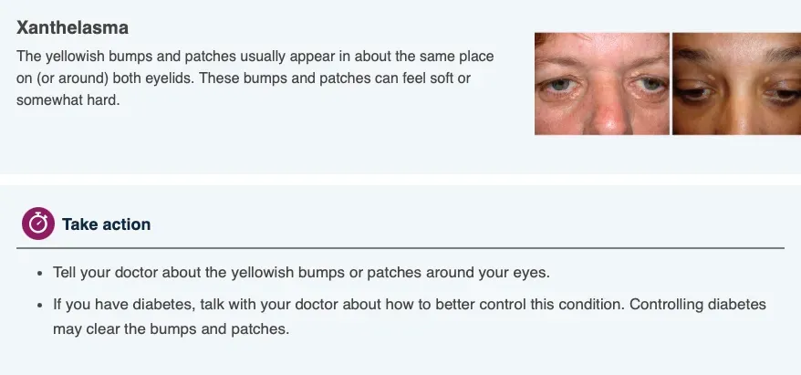 These bumps and patches develop when you have high levels of fat in your blood, which can be a sign that you have poorly controlled diabetes. The medical name for this condition is xanthelasma.