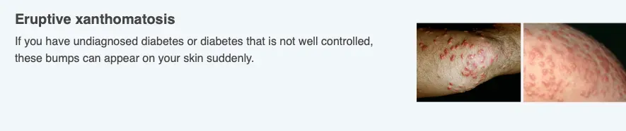 Uncontrolled diabetes can cause extremely high levels of triglycerides, a type of fat that circulates in the blood. If this happens, you can develop a skin condition called eruptive xanthomatosis.
