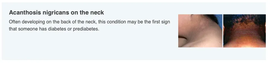 A dark patch (or band) of velvety skin on your neck, armpit, groin, or elsewhere could mean that you have too much insulin in your blood. This is often a sign of pre-diabetes. The medical name for this skin condition is acanthosis nigricans.