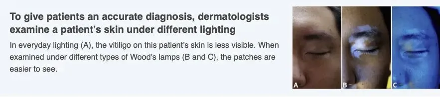To get a good look at your skin, your dermatologist may use a Wood’s lamp. This specialized lamp allows a dermatologist to clearly see areas of vitiligo.